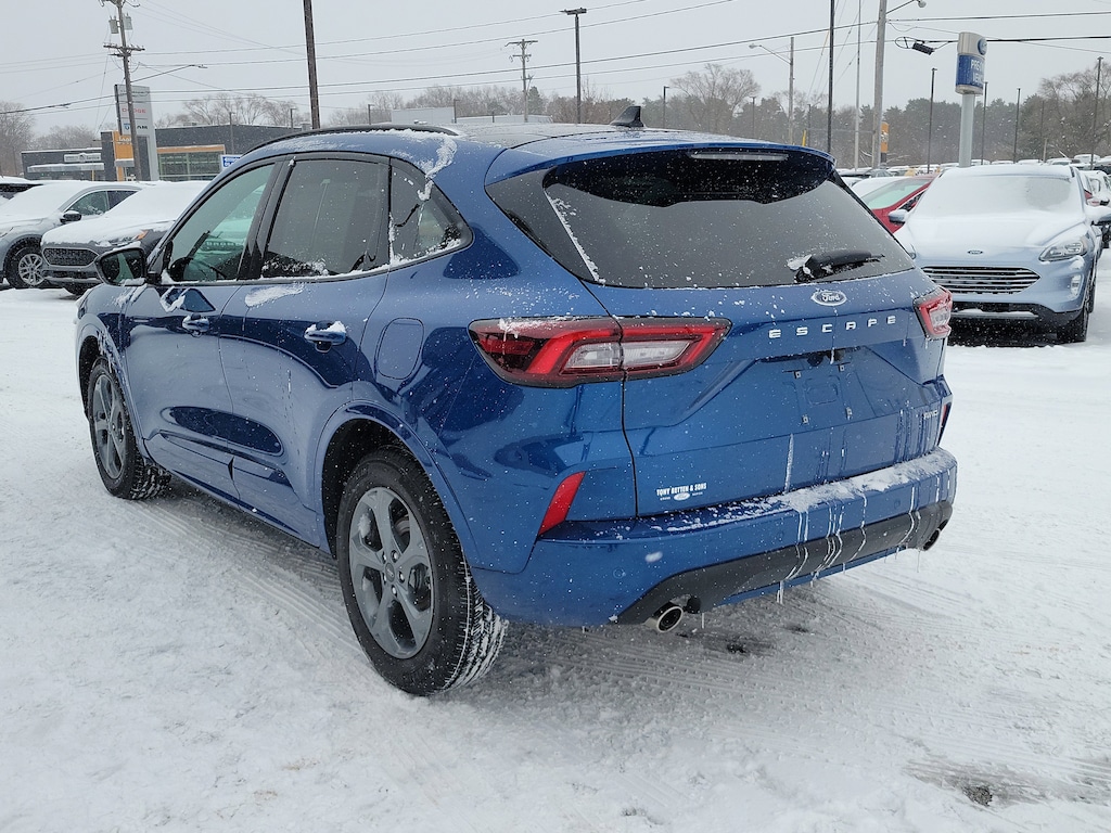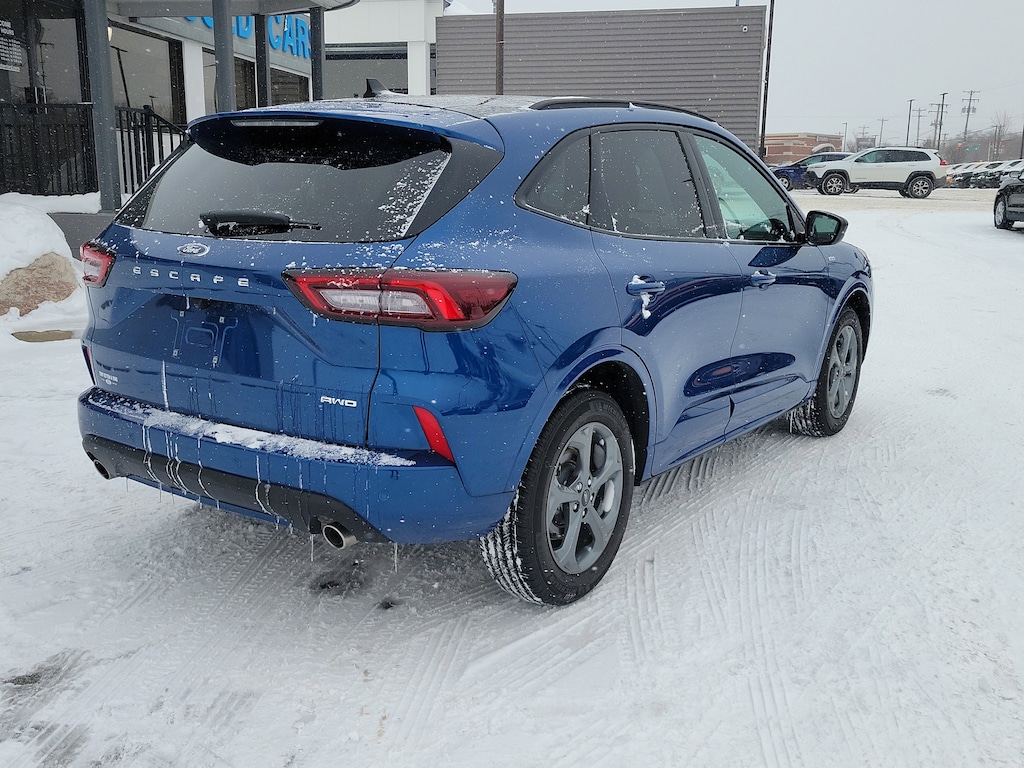 OVER 20 PRE-OWNED ESCAPES IN STOCK TO CHOOSE FROM !!! LOW MILE ONE OWNER WITH A CLEAN CARFAX HISTORY REPORT !!! ST-INE ALL WHEEL DRIVE* PANORAMIC VISTA MOONROOF* TECH #1 PKG* NAVIGATION* COLD WEATHER PKG* PUSH BUTTON START* SYNC4* 18 INCH ROCK METALLIC WHEELS* 13.2 INCH TOUCHSCREEN* REMOTE START* HEATED STEERING WHEEL* HEATED FRONT SEATS* POWER HEATED MIRRORS* SUPPLEMENTAL PTC HEATER* ADAPTIVE CRUISE* BLIS/ BLIND SPOT MONITORING SYSTEM* LANE-CENTERING ASSIST* EVASIVE STEERING ASSIST* SAFETY CANOPY* and more. Balance of Ford factory warranty. Atlas Blue Metallic Paint with Black Cloth/ Vinyl Seating. Original MSRP $36,255.